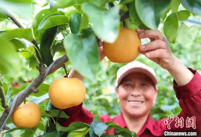 資料圖:果農(nóng)從樹上采摘秋月梨。張進(jìn)剛 攝