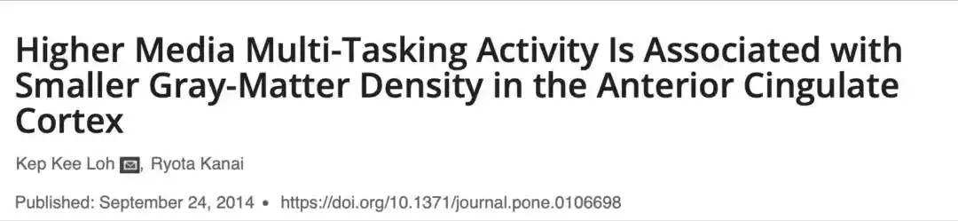 2014年《公共科學圖書館·綜合》刊發(fā)的一項研究,掃描了75個參與者的大腦,探究了“一心多用”對大腦的影響。結(jié)果發(fā)現(xiàn),一個人在平時“一心多用”的時間越久,他的大腦發(fā)生的變化越明顯。他們的前扣帶皮層的灰質(zhì)減少了,而這個腦區(qū)和認知能力息息相關。①