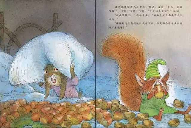 《溫尼想換個地方睡覺》是從一張床開始的:“小兔溫尼獨自坐在自己的小床上……”孤單的溫尼需要找個好伙伴一起睡覺,伙伴們都熱情地接納了他,可是最后溫尼還是回到了自己的床上,那里沒有松鼠的咔嘣聲,沒有臭鼬的怪味兒,沒有刺猬的刺,沒有熊的呼嚕聲,沒有貓頭鷹家的亮光,他終于放松地呼呼大睡了。