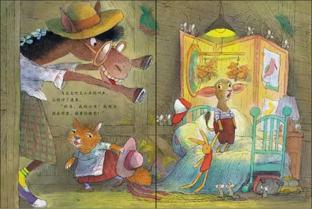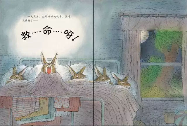 接下來的《溫尼和100只大灰狼》,不禁會讓爸爸媽媽彎起嘴角,因為很多小朋友都會在被窩里想象出許多的大怪物。“有一百只大灰狼在追我!”“肚子餓得咕咕叫的狼!”“他們還長著好大的嘴巴呢!”受到驚嚇的溫尼和他的兄弟姐妹輾轉(zhuǎn)難眠,接下來的情節(jié)也許只有在童話中才會出現(xiàn)——勇敢的兔媽媽憑借一把掃帚就把100只狼趕跑了。