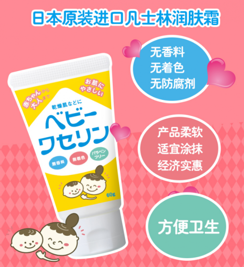 作為一款曾在日本獲得“2015年最受媽媽們喜愛的母嬰產(chǎn)品排行榜冠軍”的凡士林潤(rùn)膚霜(日本銷售名稱:嬰兒凡士林潤(rùn)膚霜),守護(hù)了許多寶寶的冬日健康肌膚。如今這個(gè)日本母嬰類產(chǎn)品銷量排行榜前列產(chǎn)品已經(jīng)來到了中國(guó)!雖然說它是一款嬰兒凡士林潤(rùn)膚霜,但是絕對(duì)是全年齡都可以使用的超性價(jià)比產(chǎn)品啊。