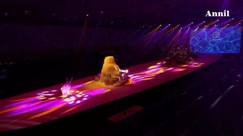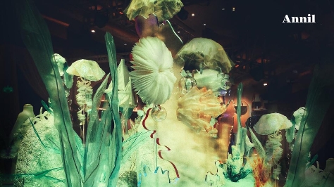首先,開場秀由一個(gè)孩子的夢境引出威尼斯海島之旅的奇幻與朦朧:一片深邃的海洋里,遠(yuǎn)處鯨魚清靈的歌聲將觀眾帶入奇幻的夢境空間。