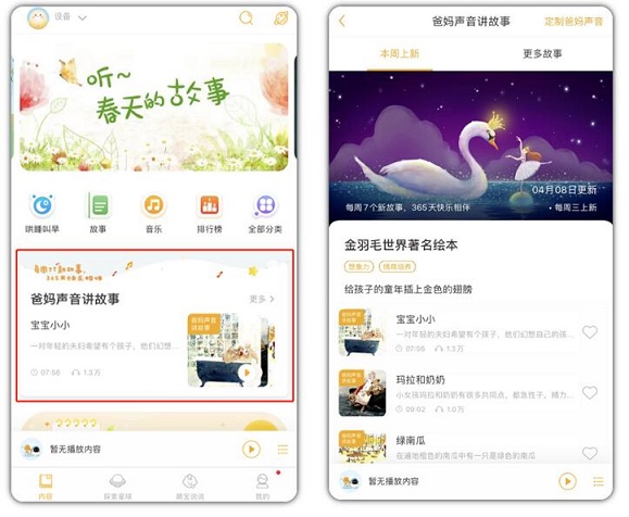 最后,還有一個小提醒喲!那就是原“蛋蛋伴讀”功能,現(xiàn)在更名為“爸媽聲音講故事”。打開阿爾法蛋APP,在「內容」頁就可以看到了。只花5分鐘,就可以定制爸爸媽媽的專屬聲音,音色語調惟妙惟肖,隨時隨地用爸爸媽媽的聲音給孩子講故事,每周7個新故事,讓阿爾法蛋智能故事機365天快樂相伴!