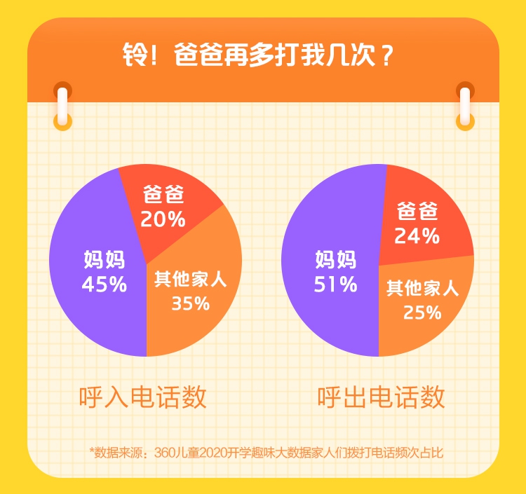 不得不令人深思的是,對于向往親情、友情的孩子們來說,爸爸媽媽的呵護(hù)和關(guān)愛無疑是他們最為渴望的。然而360兒童手表大數(shù)據(jù)卻顯示,無論是呼入電話數(shù)還是呼出電話數(shù),爸爸都不及媽媽的一半。由此可見,“粗心”的爸爸們對孩子的關(guān)愛并不夠,還需要多多加油。