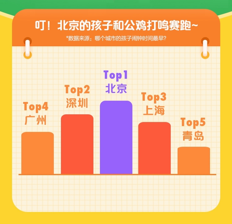 “起得比雞早,睡得比狗晚。”很多北京當(dāng)?shù)睾⒆樱矚g用這句話來自嘲和調(diào)侃。不過,報告也確實反映了一部分事實。360兒童手表大數(shù)據(jù)顯示,北京孩子的鬧鐘時間最早,其后依次才是深圳、上海、廣州和青島。換句話說,北京孩子簡直是在和公雞打鳴賽跑。