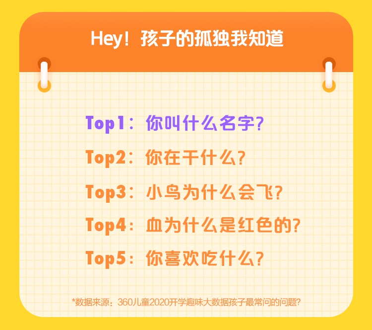 好奇是孩子的天性,處于青春爛漫的孩提時代,孩子們的內(nèi)心更是充滿無數(shù)問號。360兒童手表大數(shù)據(jù)顯示,孩子最常問的五個問題依次是,“你叫什么名字?”“你在干什么?”“小鳥為什么會飛?”“血為什么是紅色的?”“你喜歡吃什么?”其中,“你叫什么名字”,成為了孩子們最常提問的問題。這一方面反映了孩子們的好奇心,但不得不注意的是另一方面也折射出孩子們內(nèi)心的孤獨感以及對親情、友情的向往。