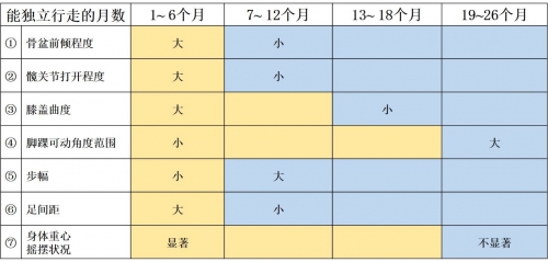 圖3 獨(dú)立行走之初1-6個(gè)月時(shí)期的行走特點(diǎn)和第七個(gè)月之后的變化