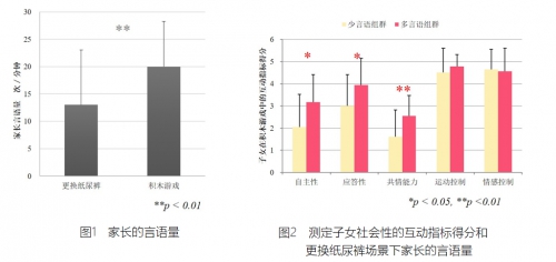 此外,根據(jù)更換紙尿褲時(shí)發(fā)出的言語量多少把家長(zhǎng)分為2個(gè)組群并分別比較其子女在積木游戲情境中測(cè)得的互動(dòng)指標(biāo)。結(jié)果顯示,更換紙尿褲時(shí)發(fā)出的言語量較多的家長(zhǎng),其子女的自主性、應(yīng)答性和共情能力的評(píng)價(jià)得分較高(圖2)。這提示了更換紙尿褲時(shí)親子互動(dòng)方式與孩子的上述這些方面的發(fā)展具有關(guān)聯(lián)性。
