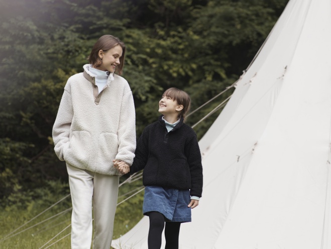 潮品7:童裝搖粒絨套頭衫,與成人裝的拼接領(lǐng)口設(shè)計(jì)呼應(yīng),配合頸部按扣設(shè)計(jì),穿脫方便,便于活動(dòng),是全家秋冬潮流之選。