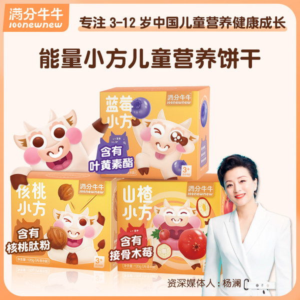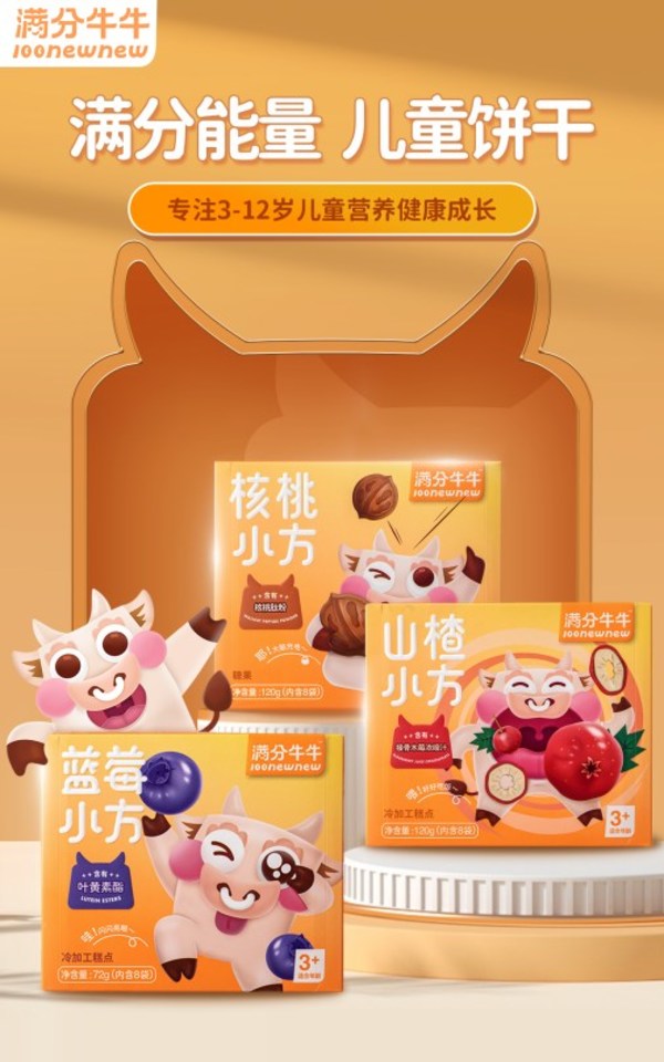 滿分牛牛的第一款產(chǎn)品能量小方,是一款符合“三減三健康”標(biāo)準(zhǔn)的兒童營養(yǎng)餅干。藍(lán)莓小方添加葉黃素酯,核桃小方添加專利核桃肽粉,山楂小方添加接骨木莓濃縮汁,幾款營養(yǎng)元素直擊精致媽媽痛點(diǎn)。同時(shí),產(chǎn)品口味專為孩子設(shè)計(jì),天然果味,香甜谷物,軟糯蛋白。媽媽們給得放心,寶貝們吃得開心。
