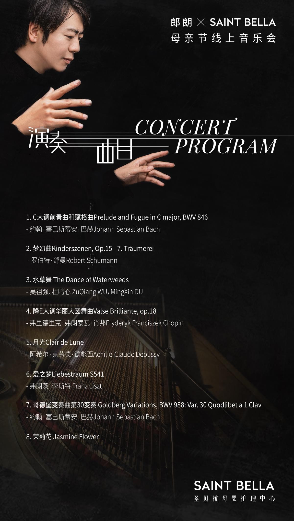 眾所周知,郎朗罕有會在線上進行專場音樂會演奏,此次選擇聯(lián)合圣貝拉,共同獻禮母親節(jié),他表示“音樂的波動,能帶給孩子和母親安全感和治愈感”,其藝術(shù)態(tài)度與圣貝拉藝術(shù)療養(yǎng)坐月理念一拍即合。音樂會直播當(dāng)晚,獻曲《愛之夢》、《哥德堡變奏曲》、《茉莉花》等曲目,選曲緊密關(guān)聯(lián)家與愛,堪稱母親節(jié)當(dāng)晚最療愈演奏。