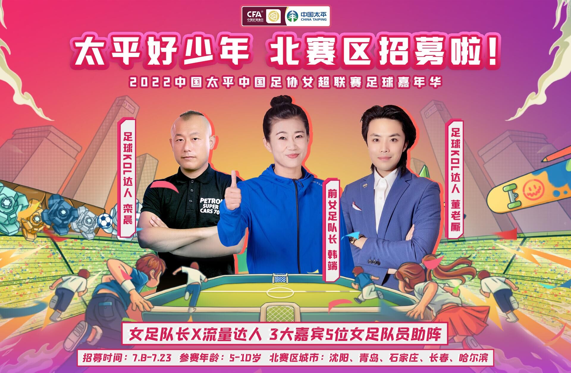 今年的太平好少年足球嘉年華活動,將特別邀請臻臻、浦瑋、韓端、董老廝、趙利紅、韓喬生、高群翔、欒晨作為明星導(dǎo)師分赴各大導(dǎo)師賽現(xiàn)場,與家長孩子們展開親密互動!他們中不僅有新興潮流運動的領(lǐng)軍人物,還有備受大眾喜愛的網(wǎng)絡(luò)流量達(dá)人,更有鏗鏘玫瑰“黃金一代”的杰出代表。同時,備受全網(wǎng)喜愛的少年偶像臻臻作為“太平好少年”形象大使,對所有熱愛足球的小朋友們發(fā)出了邀請,一起爭當(dāng)“太平好少年”!