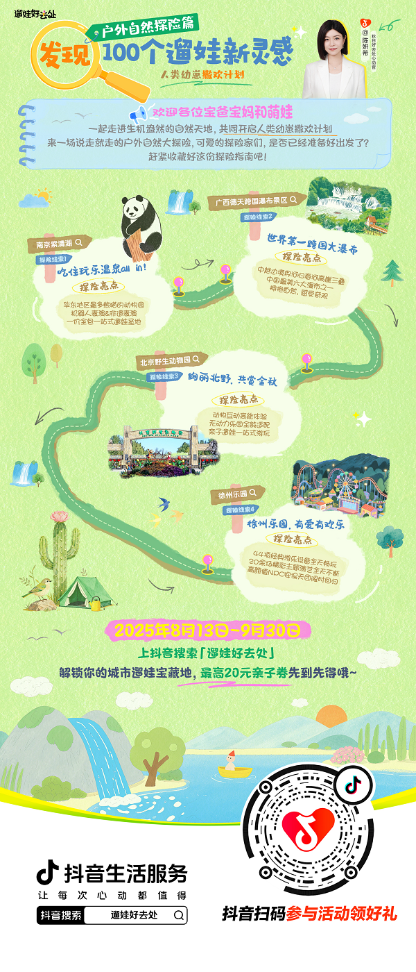 不管你是想找能讓全家歇得舒心的親子酒店、一片能奔跑觸摸自然的戶外天地,還是想圓娃童話夢(mèng)的城市樂園、能邊玩邊漲知識(shí)的文化研學(xué)——8月13日至9月30日,記得上抖音搜索“遛娃好去處”,帶話題#發(fā)現(xiàn)100個(gè)遛娃新靈感 和#遛娃好去處,輕松get你身邊的寶藏遛娃地!
