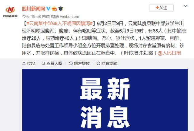 云南省陸良縣人民政府新聞辦公室6月10日通報(bào),6月2日至9日,陸良縣聯(lián)中部分學(xué)生出現(xiàn)不明原因腹瀉、腹痛、伴有嘔吐等癥狀。截至6月9日19時(shí),有68人(其中輸液治療28人,服藥治療40人)出現(xiàn)腹瀉、惡心、嘔吐癥狀,1人留院觀察。