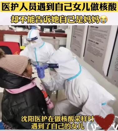 沈陽的一名醫(yī)護(hù)人員在給居民檢測的時(shí)候,遇到自己的女兒,向自己說謝謝阿姨,那一刻雖然很想哭,但是想到護(hù)目鏡要是看不清會影響工作,這位媽媽也是忍住淚水繼續(xù)堅(jiān)守在崗位。