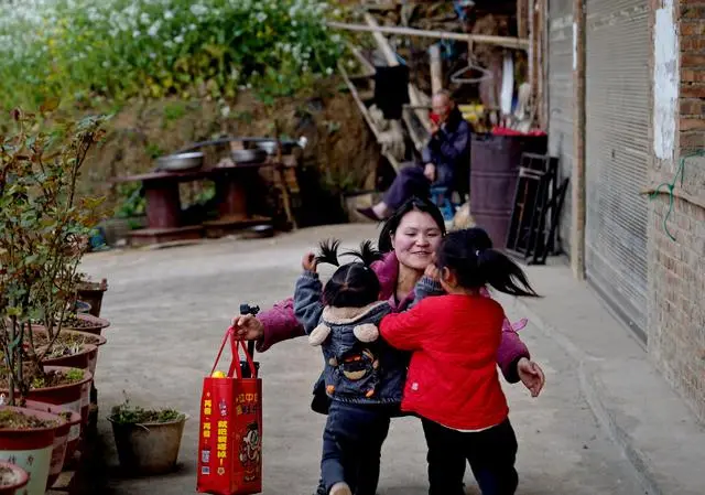 2023年3月15日,貴州省納雍縣玉龍壩鎮(zhèn)九龍?zhí)渡鐓^(qū),孩子們開心地擁入育嬰指導員王梅懷抱。(楊英 攝)