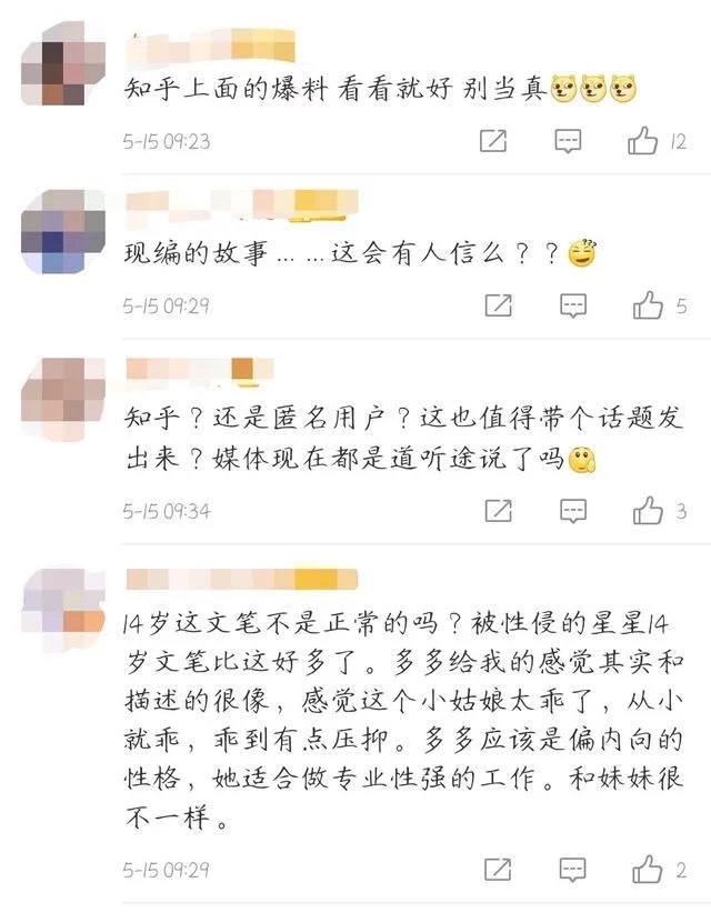 文章爆出之后,很多人紛紛表示不可信,留言道:"現(xiàn)編的故事……這會有人信么"、"這些爆料看看就好,別當真",不過也有人表示:"多多給我的感覺其實和描述的很像,感覺這個小姑娘太乖了,從小就乖,乖到有點壓抑"等等。