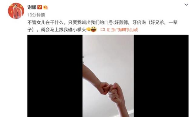 6月20日,謝娜難得休假在家陪女兒們,興奮曬出和女兒互動(dòng)視頻,視頻中,女兒的小奶音好可愛,謝娜十分激動(dòng)地喊到:“好兄弟一輩子”,然后女兒握緊拳頭,還女兒來了一個(gè)碰拳的動(dòng)作,十分溫馨。