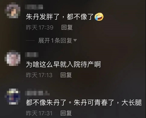 有網(wǎng)友認(rèn)為朱丹"太拼了",也有的網(wǎng)友對她住院待產(chǎn)工作產(chǎn)生了共情,稱"我也覺得工作使我快樂,生二胎的時候我也是工作到生娃的前一天",而有的網(wǎng)友只關(guān)注外貌,稱"朱丹發(fā)胖了,都不像了"。