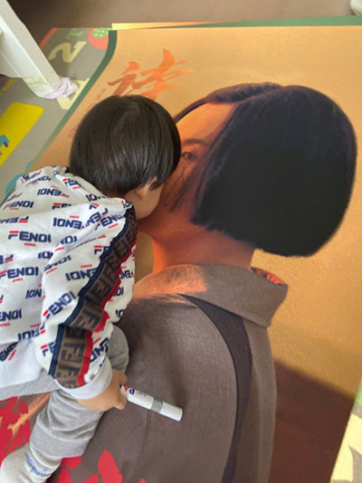 在章子怡曬出的照片里面,小寶貝正趴在地上,一邊拿著筆,一邊埋頭親吻媽媽的海報(bào)。隔著屏幕都感覺(jué)到小家伙對(duì)媽媽的愛(ài)了,真是太幸福了。