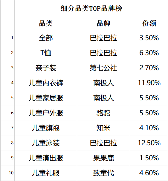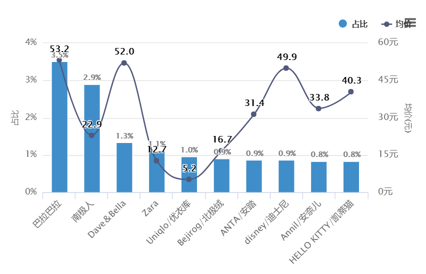 截止2019年7月線上全網(wǎng)數(shù)據(jù),巴拉巴拉市場份額最高,達3.5%。其余排名:南極人、戴維貝拉、Zara、優(yōu)衣庫、北極絨、安踏、迪士尼、安奈兒、凱蒂貓。