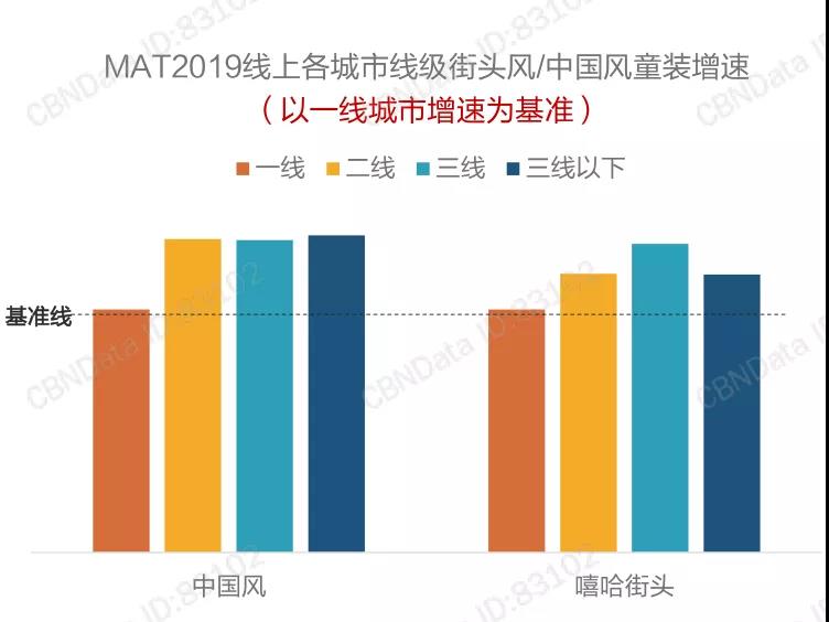 國風(fēng)風(fēng)格的童裝在相對飽和的一線城市增速比較慢,但是也略高于增速基準(zhǔn)線。在二、三線城市甚至更下沉城市,增速相差不多,且增速較高,所以中國風(fēng)有在全國蔓延的趨勢。