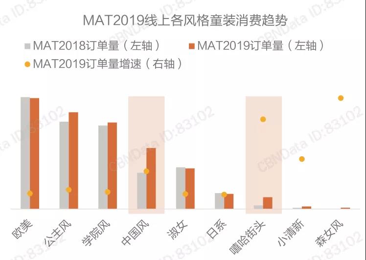 根據(jù)CBNData消費大數(shù)據(jù)顯示:2019年線上各風(fēng)格童裝消費趨勢中,訂單量增速最高的是“喜好街頭”風(fēng);值得一提的是中國風(fēng)在訂單量基數(shù)本就比較高的情況下,還保持著比較高的增長速度。另外森女風(fēng)雖然增速比較高,但是體量太小,目前還不成規(guī)模。所以在各風(fēng)格中脫穎而出的是中國風(fēng)和嘻哈街頭風(fēng)。