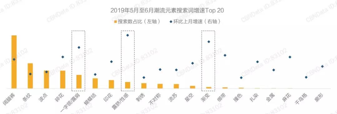 根據(jù)CBNData消費大數(shù)據(jù)顯示:在2019年5月-6月潮流元素搜索詞增速TOP20中“闊腿褲”以極大的優(yōu)勢超越其他熱搜詞,其次是條紋、波點元素;另外,相較同期,潮流元素環(huán)比上月增速最快的是“露臍/性感”、“漸變”、“一字領(lǐng)/露肩”。受街頭風(fēng)的影響,童裝的流行元素也偏向“大膽”。露臍、露肩、漸變受到消費者青睞。