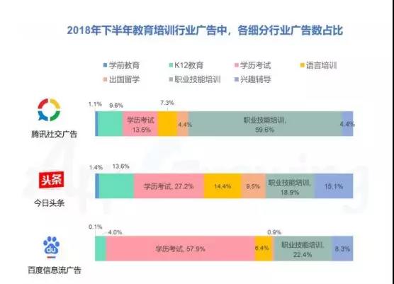 對于早教/學前教育常見的廣告類型,包括智力開發(fā)(少兒編程)、啟蒙教育(兒歌/英語/識字)、學前班、早教機構(gòu)、托管機構(gòu)等。統(tǒng)計發(fā)現(xiàn)2018年下半年,學前教育今日頭條廣告投放占比最高達1.4%,其次為騰訊社交廣告1.1%,以及百度信息流廣告0.1%。其中K12教育今日頭條占比最高達13.6%,學歷考試百度信息流廣告占比最高57.9%,騰訊社交廣告則是職業(yè)技能培訓占比最高達59.6%。