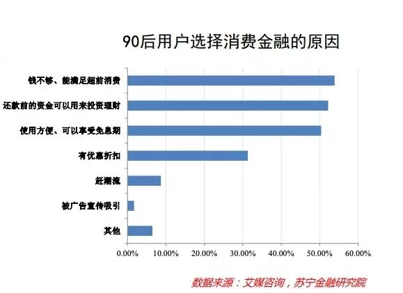 據(jù)蘇寧金融研究院發(fā)布的《90后:互聯(lián)網時代的原生民》報告顯示,超前消費是90后人群的常態(tài),有超過50%的90后用戶選擇消費金融的原因在于錢不夠、能滿足超前消費的需求。可見,生長在物質大爆發(fā)的年代,優(yōu)質的成長環(huán)境最終導致90后儲蓄意識較弱,更加偏好超前消費。
